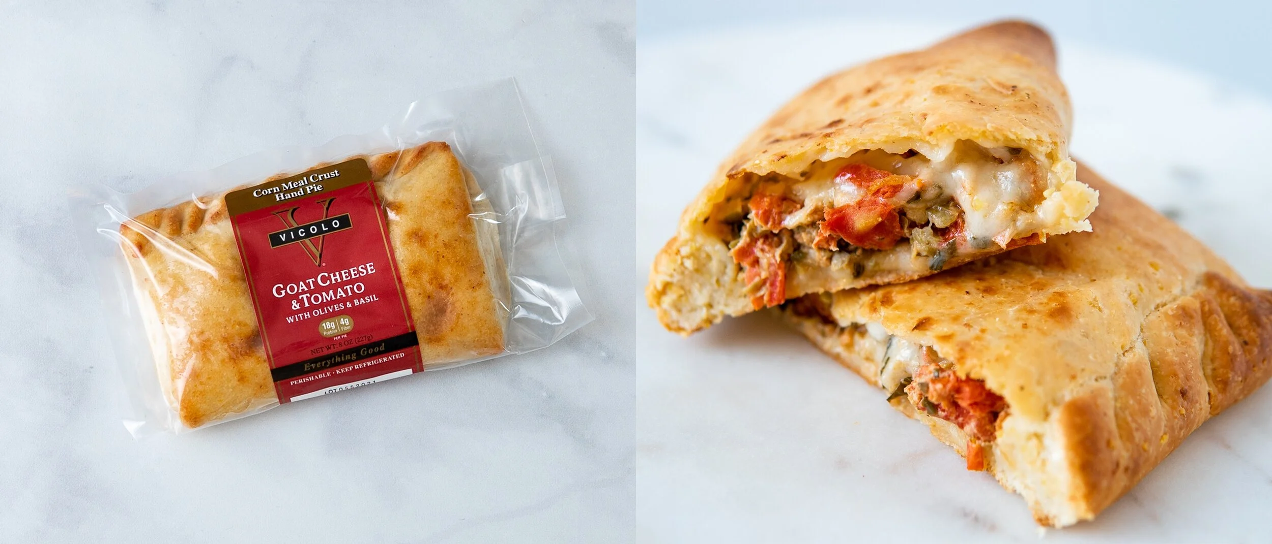 Cornmeal Crust (unbleached flour, water, non-GMO corn meal, organic soybean oil, yeast, salt), Tomatoes, Whole Milk Mozzarella (cultured pasteurized whole milk, salt, enzymes), Goat Cheese (pasteurized goat milk, salt, enzymes), Green Olives (olives, water, salt, lactic acid), Capers (capers, water, vinegar, salt), Fresh Basil.